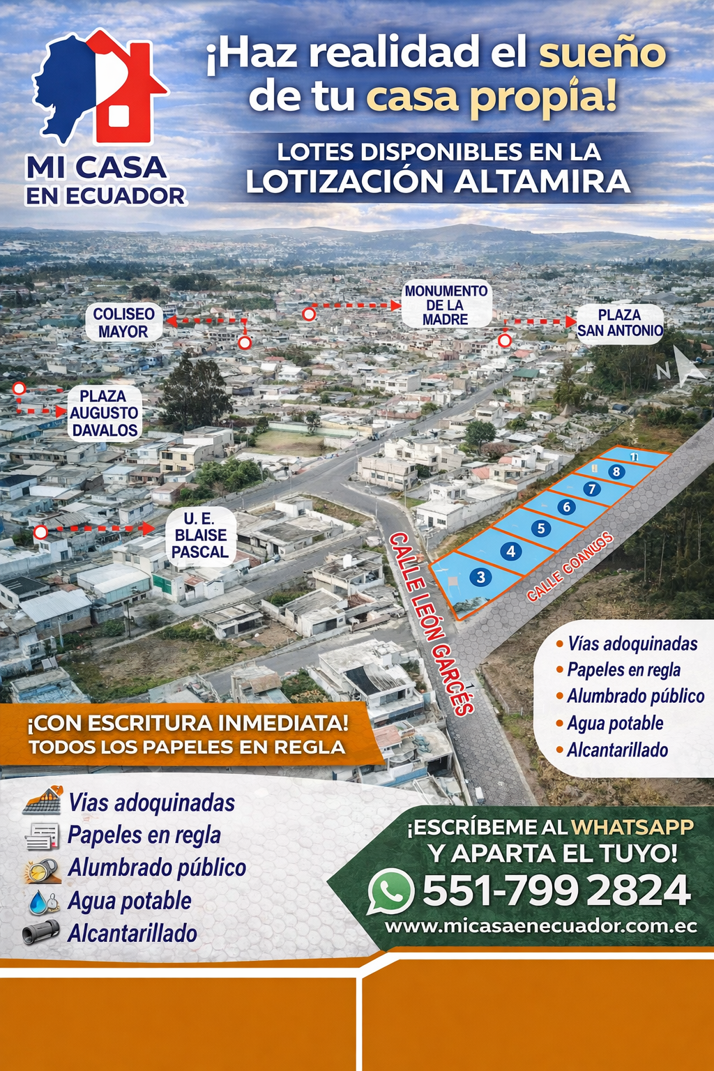 - Infraestructura: Vía adoquina de 10 metros, aceras y bordillos, alumbrado publico